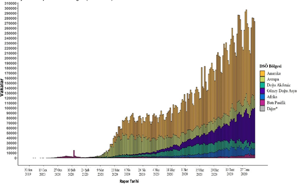 Şekil 2. Rapor tarihi ve DSÖ bölgesine göre doğrulanmış COVID-19 vakalarının sayısı, 30 Aralık 2019 – 9 Ağustos 2020**