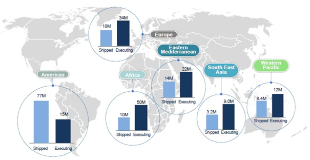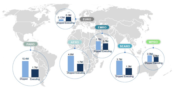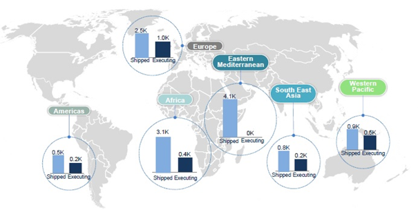 Teşhis Konsorsiyumu üyeleri - DSÖ, UNICEF, Birleşmiş Milletler Kalkınma Programı (UNDP), Küresel Fon, Küresel İlaç Tesisi ve diğer ortaklar 83 ülkeye 18 milyon polimeraz zincir reaksiyonu (PCR) testi ve 78 ülkeye 4 milyon numune toplama kiti tedarik ve sevk etmiştir.