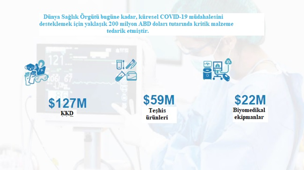 - DSÖ, COVID-19 Tedarik Portalı (https://covid19supply.who.int/) aracılığıyla talep edilebilecek kişisel koruyucu donanım, tıbbi ekipman, tıbbi sarf malzemeleri, tek kullanımlık cihazlar, laboratuvar ve testle ilgili cihazlar dahil tüm tıbbi cihazları listeleyen Acil Durum Küresel Tedarik Zinciri Sistemi (COVID-19) kataloğunu (https://www.who.int/publications/i/item/emergency-global-supply-chain-system-(covid-19)-catalogue) yayınlamıştır.
