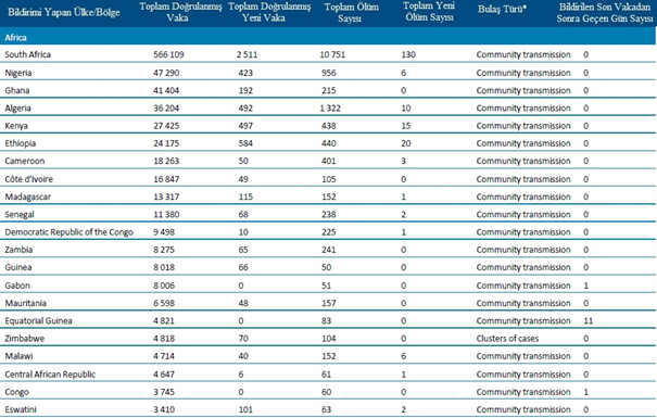 - Beklemede: DSÖ’ye bulaşma sınıflandırmasını henüz rapor etmeyen ülkeler/bölgeler