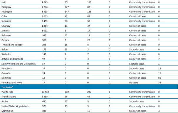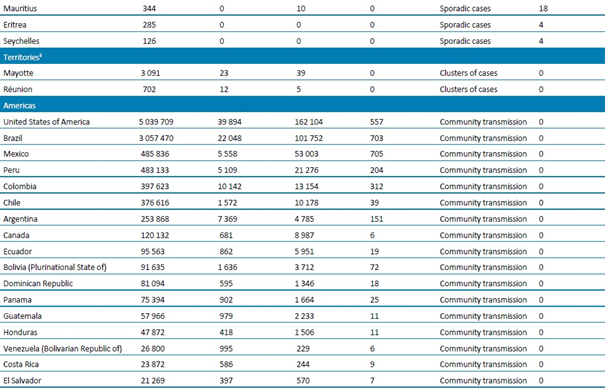 - Amerika'da 390.000'den fazla insanı öldüren COVID-19 salgını, tüberküloz, HIV, hepatit ve diğerleri de dahil olmak üzere bulaşıcı hastalıkları ortadan kaldırmak ve kontrol etmek için bölgesel planları tehdit etmekte, demiştir DSÖ Amerika Bölge Müdürü Dr. Carissa F. Etienne (https://www.paho.org/en/news/11-8-2020-covid-19-threatens-plans-eliminate-and-control-infectious-diseases-paho-director).