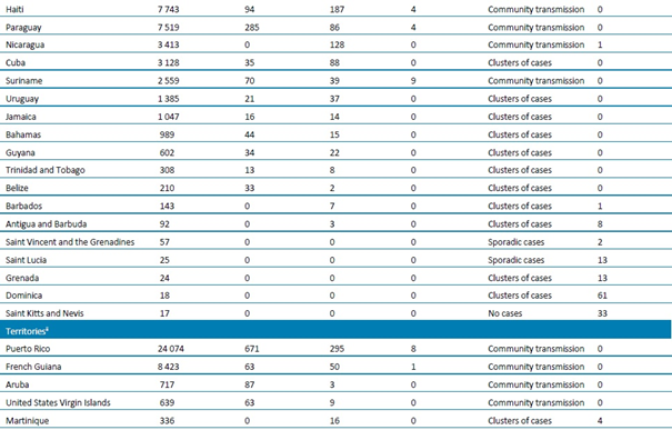 (1) Bulaşma sınıflandırması, ülkelerin/bölgelerin kendilerini raporlama sürecine dayanmaktadır. Sınıflandırmalar, haftalık olarak gözden geçirilmekte ve yeni bilgiler elde edildikçe düzeltilmektedir ve bildirilen en yüksek kategoriye dayanmaktadır. Ülkeler/Bölgeler arasında farklı bulaşma dereceleri olabilir. Kategoriler: