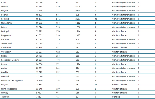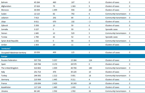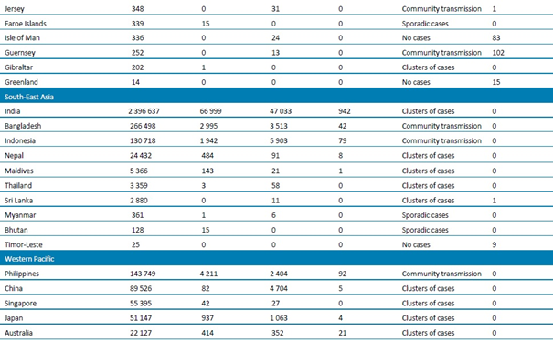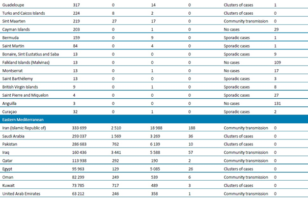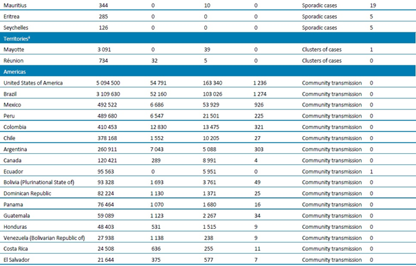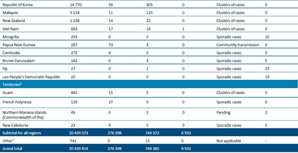 Tablo 1. DSÖ bölgesine göre, laboratuvarda doğrulanmış COVID-19 vakaları ve ölümleri bildirilen ülkeler veya bölgeler. Orta Avrupa Zaman Dilimine göre sabah 10.00 itibarıyla bildirilen veriler, 13 Ağustos 2020**