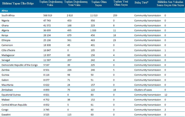 - Beklemede: DSÖ’ye bulaşma sınıflandırmasını henüz rapor etmeyen ülkeler/bölgeler