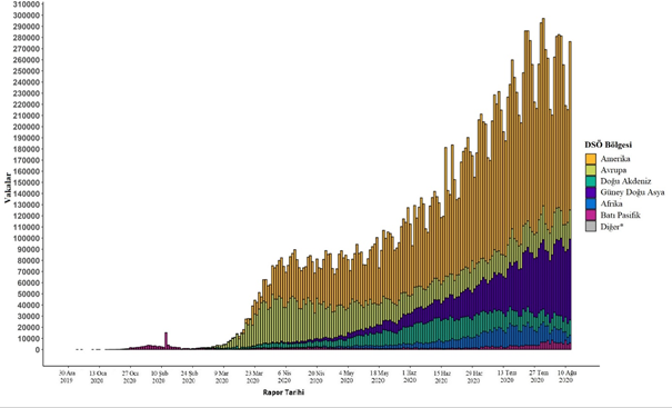 Şekil 2. Rapor tarihi ve DSÖ bölgesine göre doğrulanmış COVID-19 vakalarının sayısı, 30 Aralık 2019 – 13 Ağustos 2020**