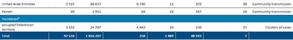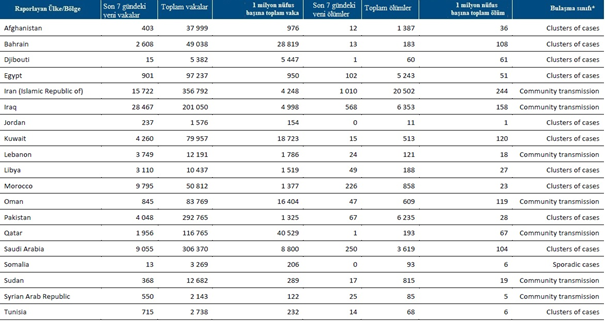 Tablo 4. Ülkelere ve bölgelere göre son yedi günde bildirilen doğrulanmış COVID-19 vakalarının ve COVID-19 kaynaklı ölümlerin sayısı, Doğu Akdeniz Bölgesi, 23 Ağustos 2020 verileri **