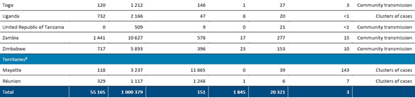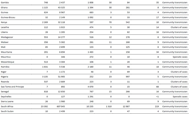 Etiyopya, vaka ve ölümlerde artış bildirmeye devam etmiştir; benzer şekilde Namibya ve Nijerya da vaka sayısında sırasıyla %55 ve %19 artış bildirmiştir. Mauritius, 22 gün hiçbir vaka olmadığı halde, komşu bir ülkeden ülkelerine geri gönderilenler arasında iki yeni vaka bildirmiştir.
