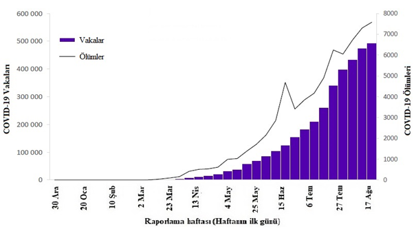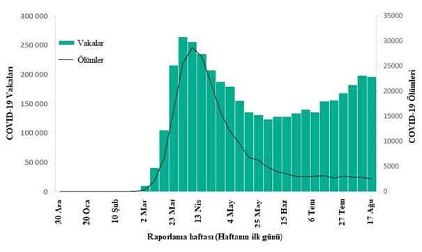 Şekil 6: Avrupa Bölgesi'nde haftalık olarak bildirilen COVID-19 vakalarının ve ölümlerin sayısı, 23 Ağustos 2020 verileri**