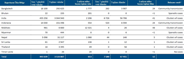 Güney-Doğu Asya, en çok etkilenen ikinci bölgedir ve şu anda küresel olarak son yedi gün içinde yeni bildirilen vakaların ve ölümlerin sırasıyla %28 ve %15'ini oluşturmaktadır. Bölgede, son yedi günde %4'lük bir artışla bildirilen vakalar ve ölümler istikrarlı bir artış göstermiştir (Şekil 7). Vakaların çoğunu hala Hindistan rapor etmektedir ve üç milyonun üzerinde toplam vaka bildirmiştir, bu da tüm bölgesel doğrulanmış vakaların %86'sını oluşturmaktadır (Tablo 6).