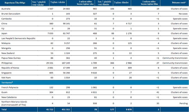 Batı Pasifik Bölgesi'nde bildirilen vaka sayısı, Japonya, Avustralya, Singapur, Çin ve Vietnam tarafından bildirilen yeni vaka sayısındaki düşüşün ardından %5 azalmıştır (Şekil 8, Tablo 7). Güney Kore, esas olarak dini toplantılarla ilgili vakalardaki artış nedeniyle vakalarda %180'lik bir artış bildirmiştir.