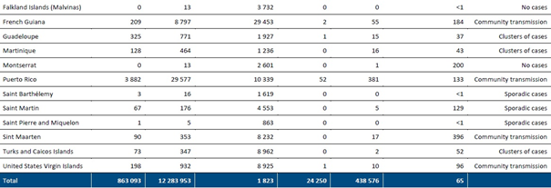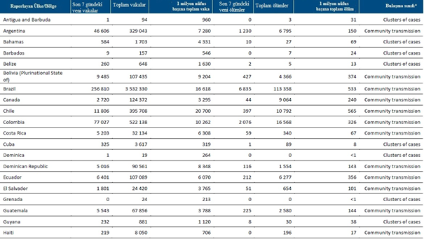 Bununla birlikte, Bahamalar, Trinidad ve Tobago, Guadeloupe, Jamaika ve Guyana da dahil olmak üzere Karayip adalarındaki birçok ülke ve bölge, son yedi gün içinde vaka ve ölümlerde büyük bir artış bildirmiştir. Karayip adalarında gözlemlenen vakalardaki artış, kısmen turizmdeki artıştan kaynaklanıyor olabilir.