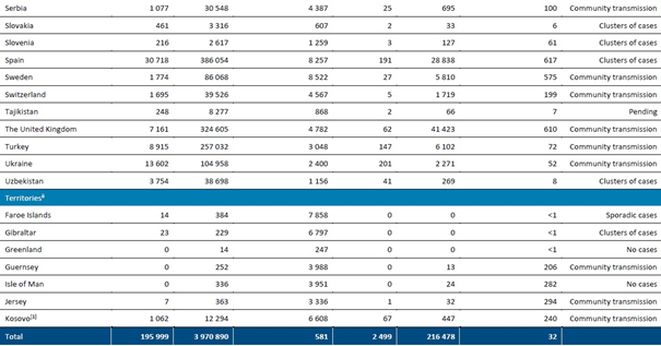 Tablo 5. Ülkelere ve bölgelere göre son yedi günde bildirilen doğrulanmış COVID-19 vakalarının ve COVID-19 kaynaklı ölümlerin sayısı, Avrupa Bölgesi, 23 Ağustos 2020 verileri **