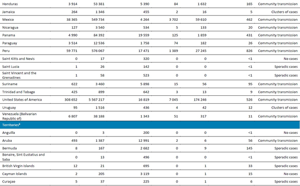Tablo 3. Ülkelere ve bölgelere göre son yedi günde bildirilen doğrulanmış COVID-19 vakalarının ve COVID-19 kaynaklı ölümlerin sayısı, Amerika Bölgesi, 23 Ağustos 2020 verileri **