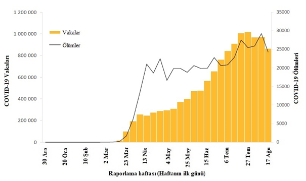 23 Ağustos'ta sona eren haftada, bir önceki haftaya (10-16 Ağustos) göre vaka sayısında %4 azalma ve ölüm sayısında %5 artış ile, 1,7 milyondan fazla yeni COVID-19 vakası ve 39.000 yeni ölüm bildirilmiştir (Şekil 1). Şimdiye kadar toplamda 23 milyondan fazla vaka ve 800.000 ölüm rapor edilmiştir.