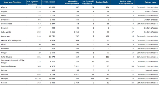 Afrika Bölgesinde bildirilen vaka ve ölüm sayıları, son yedi günde sırasıyla %8 ve %11 azalmıştır; bunun başlıca sebebi Cezayir, Kenya, Gana, Senegal ve Güney Afrika'da bildirilen vakalardaki düşüşlerdir (Şekil 3, Tablo 2).
