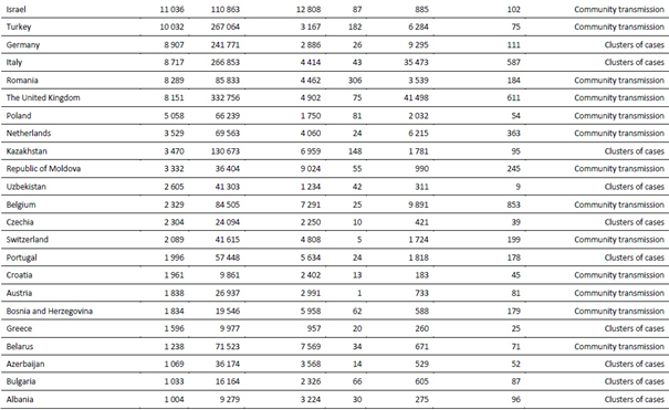Avrupa Bölgesinde kademeli artışlar görülmeye devam etmektedir (Şekil 6); İspanya, Rusya, Fransa ve Ukrayna bu hafta en yüksek yeni vaka sayısını bildirmiştir. İspanya'da, Temmuz ayının ortasından bu yana bulaş yeniden artmaya başlamıştır ve vakalar şimdi daha önce Mart ve Nisan aylarında görülen zirvelere ulaşmaktadır. Temmuz ve Ağustos, İspanya'da tatil mevsimidir ve sosyal etkileşimler büyük olasılıkla bildirilen vaka sayısının artmasına katkıda bulunmuştur. İspanya, temaslı takibi faaliyetlerini desteklemek için orduyu görevlendirmiştir.