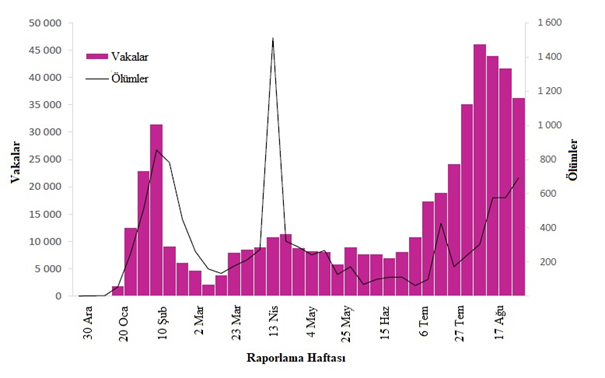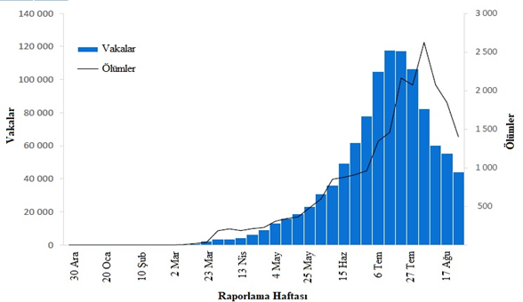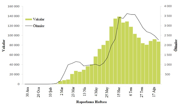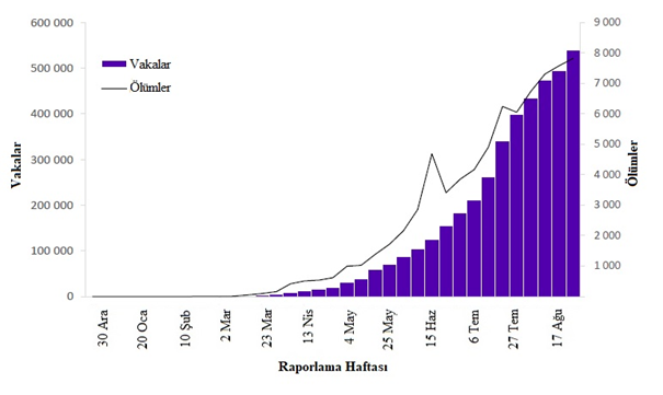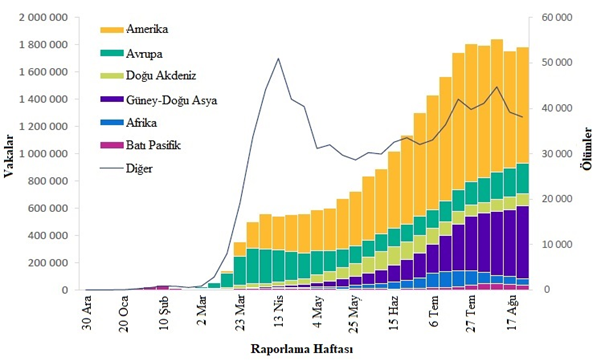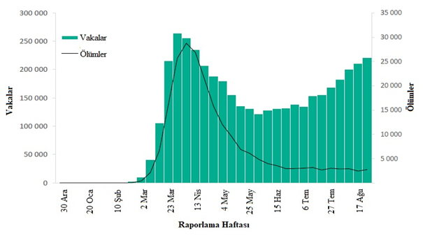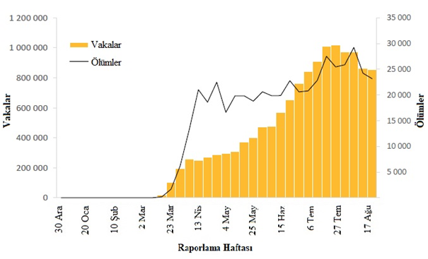 30 Ağustos tarihinde sona eren haftada DSÖ'ye 1,8 milyondan fazla yeni COVID-19 vakası ve 38.000 yeni ölüm bildirilmiştir; önceki haftaya (17 ila 23 Ağustos) göre vaka sayısında %1 artış ve ölüm sayısında %3 azalma görülmektedir (Şekil 1). Salgının başlamasından bu yana toplamda yaklaşık 25 milyon vaka ve 800.000 ölüm rapor edilmiştir.