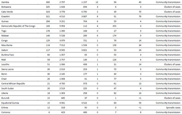 Gana, Kenya, Gabon ve Madagaskar'ın da dahil olduğu, bölgedeki önceki COVID-19 sıcak noktaları olan birkaç ülke, vaka oranında bir azalma kaydetmiştir. Gözlemlenen düşüş eğilimleri cesaret verici olsa da, rakamlar, mevcut test kapasitesi ve stratejisi ile raporlamadaki gecikmeler gibi birçok faktörden etkilenebilecekleri için dikkatli bir şekilde yorumlanmalıdır.