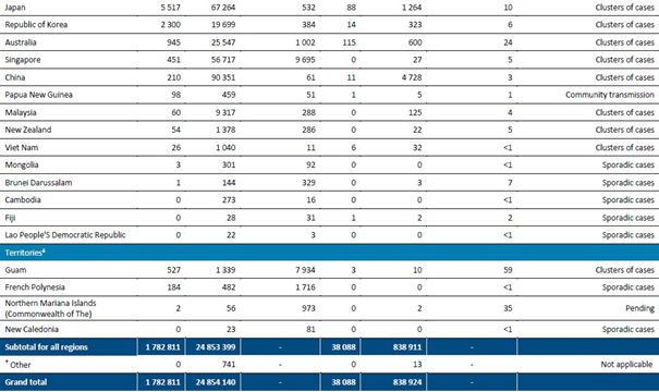 Filipinler ve Japonya, bu hafta bölgedeki en yüksek sayıda yeni vakayı bildirmiştir; ancak Japonya'daki vakalar Haziran ayının sonundan bu yana azalırken, bu hafta bildirilen genel vakalarda geçen haftaya göre %22 düşüş görülmektedir. Filipinler'de, vakaların büyük bir yüzdesi Ulusal Başkent Bölgesi'nden rapor edilmiştir.