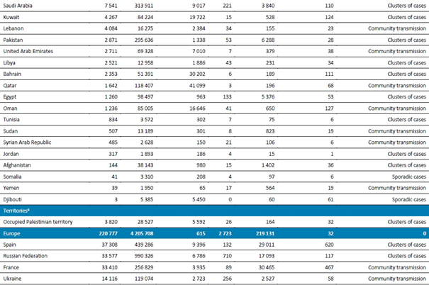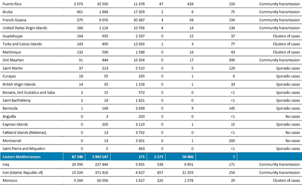 Doğu Akdeniz Bölgesi, son haftalarda dalgalı bir yeni vaka insidansı gözlemlemiştir (Şekil 5). En fazla yeni vaka Irak, İran, Fas, Suudi Arabistan ve Kuveyt'te görülmüştür. DSÖ, Irak Sağlık Bakanlığı ve uygulayıcı ortaklarıyla ortaklaşa, insanları COVID-19 bulaşmasını sınırlandırma önlemleri konusunda eğitmek için, toplumsal sosyal yardım çabalarını yoğunlaştıran bir COVID-19 farkındalık artırma kampanyasının başka bir turunu tamamlamıştır (http://www.emro.who.int/irq/iraq-news/who-concludes-covid-19-awareness-raising-campaign-in-the-south.html). Kampanya, Basra, Vasit, Dikar ve Missan'da yoğun nüfuslu ve etkilenen dört bölgede 5 milyondan fazla kişiye ulaşmıştır. Kampanya ekipleri Kürdistan bölgesine taşınmaktadır ve Süleymaniye ilinde yoğun nüfuslu, yüksek riskli 9 bölgeyi hedef alacaktır. DSÖ ayrıca geçtiğimiz hafta içinde Kürdistan bölgesi Sağlık Bakanlığı'na 6 ambulans ve 22 ton COVID-19 ekipmanı teslim etmiştir (http://www.emro.who.int/irq/iraq-news/who-delivers-ambulances-and-health-technologies-to-ministry-of-health-in-the-kurdistan-region-to-support-covid-19-containment-efforts.html?format=html).