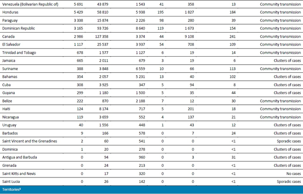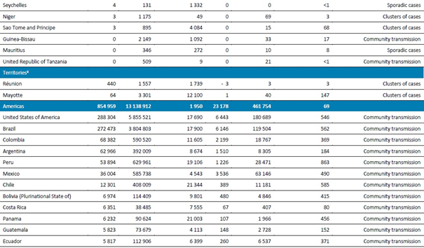 Arjantin, Haziran ayından bu yana haftalık olarak bildirilen vaka sayısında yeni zirveler ve vakalarda ve ölümlerde yukarı yönlü bir eğri bildirmiştir. Meksika'daki vakalar geçen hafta %6, Ağustos ayı boyunca kademeli olarak azalmıştır. Meksika, bulaşmayı azaltmak için çocuklara uzaktan eğitim ve öğretim uygulamaktadır.