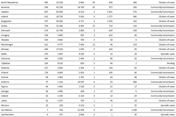 Şekil 2. Ülkelere ve bölgelere göre, son yedi günde 1 milyon nüfus başına bildirilen COVID-19 vakası, 24 Ağustos - 30 Ağustos 2020 **