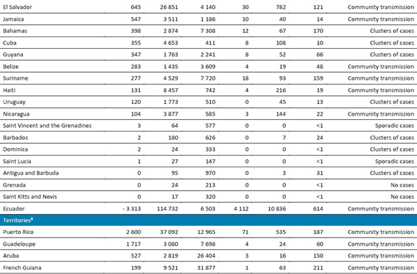 Rakamlar, bölgedeki diğer ülkelere kıyasla nispeten düşükken (Tablo 2), Guadeloupe bu hafta en yüksek vaka sayısını bildirmiştir; önceki haftalık güncellemedeki 428 yeni vakadan bu hafta 1717 yeni vakaya yükselmiştir ve bulaşma modeli vaka kümelerinden genel bulaşmaya geçmiştir. Toplam vaka ve ölümlerde, son yedi günde bölgenin nüfusuna göre vakalarda %100'ün üzerinde (bir milyon nüfus başına 3406'den 7698'e) ve toplam ölümlerde %20 artış (bir milyon nüfus başına 50'den 60'a) olmuştur.