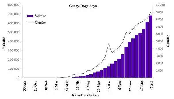 Şekil 7: DSÖ Güney-Doğu Asya Bölgesi tarafından 13 Eylül 2020 itibarıyla haftalık olarak bildirilen COVID-19 vakalarının ve ölümlerin sayısı**