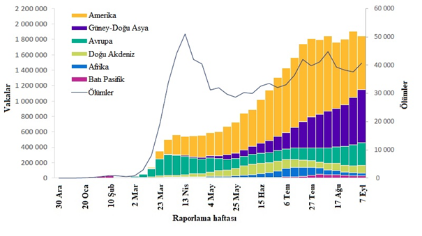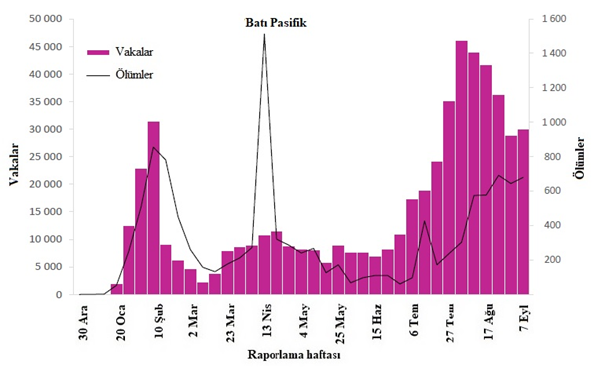 Şekil 8: DSÖ Batı Pasifik Bölgesi tarafından 13 Eylül 2020 itibarıyla haftalık olarak bildirilen COVID-19 vakalarının ve ölümlerin sayısı**