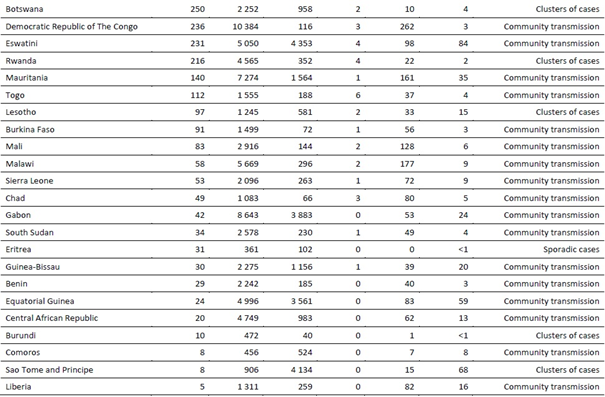 Güney Afrika, bölgede bildirilen en yüksek toplam vaka sayısını oluşturmaya devam ederken (Tablo 2), bir milyon nüfus başına en yüksek hastalık insidansı Mayotte'dedir (bir milyonda 12.367). Bir milyon nüfus başına toplam ölümler, Güney Afrika'da en yüksek düzeydedir (bir milyon nüfus başına 260).