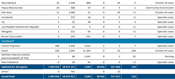 Genel olarak, Batı Pasifik Bölgesi milyon nüfus başına en düşük toplam vakalara (278) ve ölümlere (6) sahiptir. Filipinler, Japonya ve Güney Kore bölgedeki en fazla sayıda yeni vakaya sahip ülkelerdir, ancak Singapur, 9804 ile bir milyon nüfus başına en yüksek toplam vaka sayısına sahiptir. Malezya, haftalık yeni vakalarda yaklaşık %650 artış göstermiştir; ülkede günde ortalama 68 vaka görülmüştür. Bundan önce Malezya, Temmuz ayının sonundan bu yana günde 20'den az vaka bildirmekteydi. Son yedi günde bir milyon nüfus başına toplum vaka sayısı %5 artarak milyon nüfus başına 305 vakaya yükselmiştir.