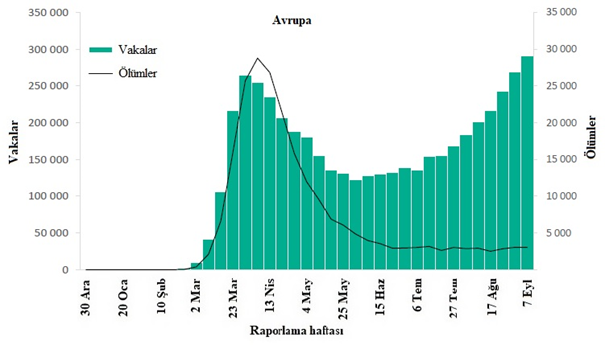 Şekil 6: DSÖ Avrupa Bölgesi tarafından 13 Eylül 2020 itibarıyla haftalık olarak bildirilen COVID-19 vakalarının ve ölümlerin sayısı**