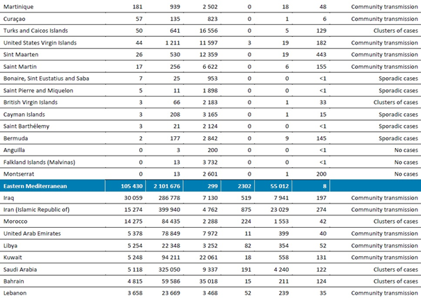 Bölgedeki vakalar, son yedi günde %14 artışla artmaya devam etmektedir ve şu anda küresel vakaların %6'sını oluşturmaktadır. Mevsimsel dini ve kültürel kitle toplantıları, düğün kutlamaları ve diğer sosyal etkinlikler, bölgedeki farklı ülkelerde vakaların artmasına neden olmuştur. Tunus ve Ürdün'de bildirilen vakaların görülmesi törenler ve kutlamalarla ilişkilendirilmiştir.