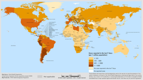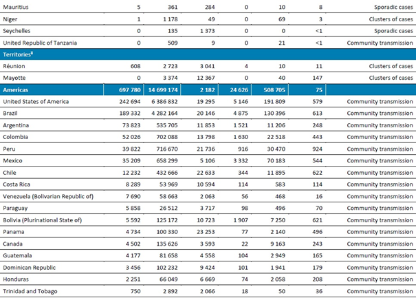 Amerika Bölgesi, haftalardır sürekli olarak rapor edilen en yüksek vaka sayısını kaydetmektedir. Raporlama haftasında vakalar azalmış olsa bile, küresel toplam vaka sayısının neredeyse yarısını oluşturmaya devam etmektedir. Afrika Bölgesi de bu hafta bildirilen vakalarda düşüş göstermiş ve ölümlerde düşüş bildiren tek bölge olmuştur.