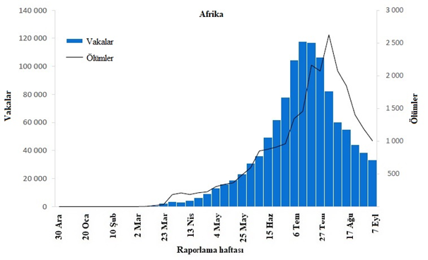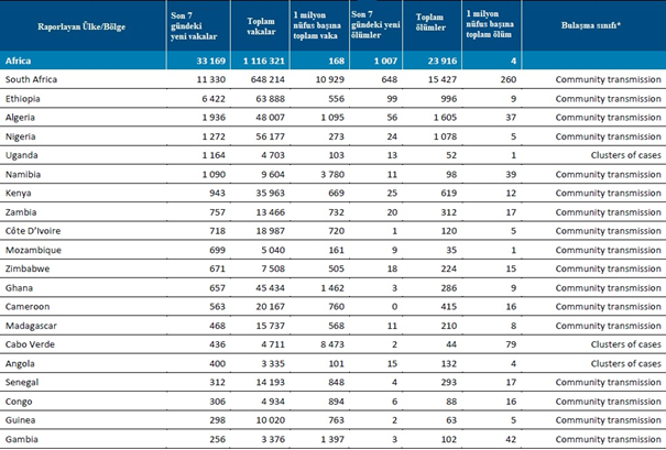 Afrika Bölgesi, bildirilen yeni vaka sayısında düşüş eğilimlerine tanık olmuştur (son yedi günde vakalarda %14, ölümlerde %15 azalma) ve virüsten etkilenen 47 ülkeden 26'sı geçen hafta düşüş bildirmiştir. Bu cesaret verici olsa da, bazı alanlarda raporlamadaki gecikmelerle birlikte, test kapasitesi ve strateji gibi birçok faktör bu eğilimleri etkiliyor olabileceğinden, hala ihtiyatlı olmak gerekmektedir.