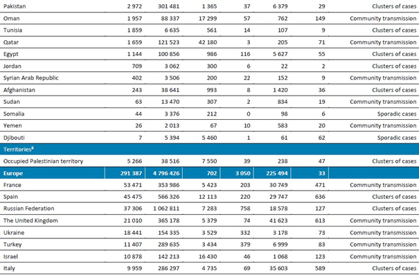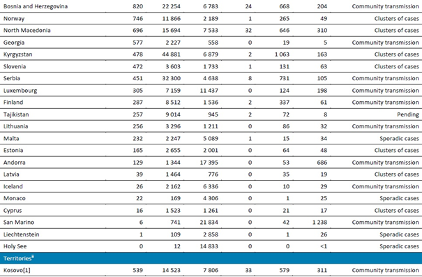 Avrupa bölgesi, küresel toplamın %16'sına tekabül eden üçüncü en yüksek yeni vaka sayısını bildirmiştir ve ikinci bir milyon nüfus başına en yüksek toplam vaka sayısına sahip bölgedir (bir milyon nüfus başına 5172 vaka).