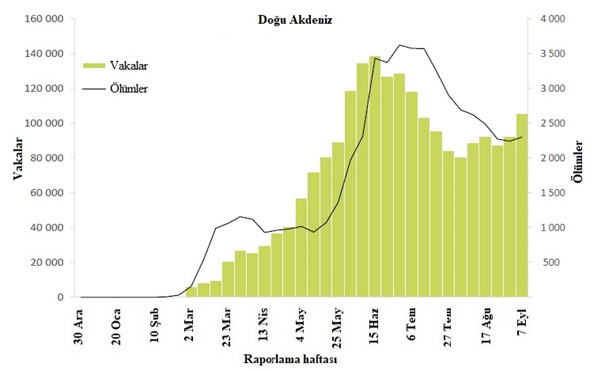 Şekil 5: DSÖ Doğu Akdeniz Bölgesi tarafından 13 Eylül 2020 itibarıyla haftalık olarak bildirilen COVID-19 vakalarının ve ölümlerin