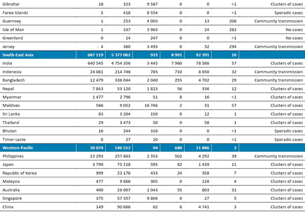 Maldivler, nüfusuna göre en yüksek toplam vaka sayısını oluştursa da (milyon nüfus başına 16.746), Güney-Doğu Asya Bölgesi'nde, Hindistan, Endonezya ve Bangladeş en fazla vakayı bildirmeye devam etmektedir. Bölge, son yedi günde tüm yeni ölümlerin %22'sini kaydetmiştir, ancak bölge nüfusuna göre düşük genel toplam ölüm sayısını korumaktadır (bir milyon nüfus başına 46).