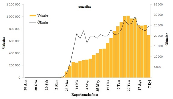 Şekil 4: DSÖ Amerika Bölgesi tarafından 13 Eylül 2020 itibarıyla haftalık olarak bildirilen COVID-19 vakalarının ve ölümlerin sayısı**