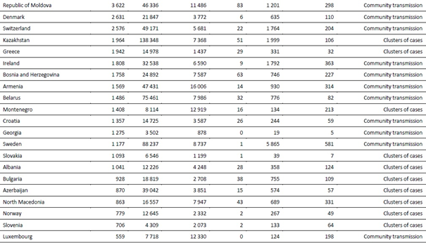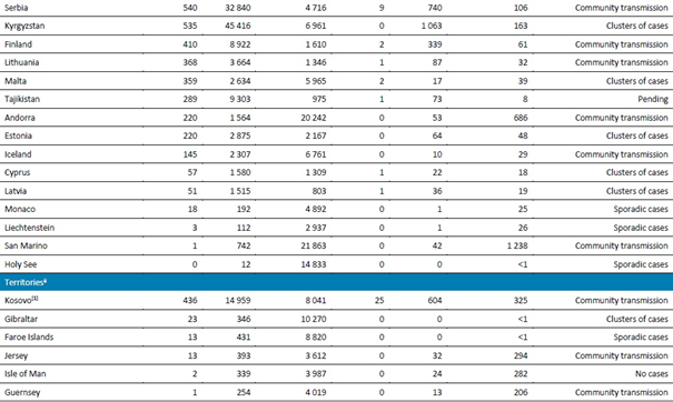 Bölge, son dört hafta içinde bildirilen ölümlerin sayısında hafif bir artış yaşamaktadır ve yeni ölüm sayısı son yedi gün içinde 4000'den fazlaya ulaşmıştır. Macaristan ve Danimarka geçen hafta ölümlerde, göreli en yüksek artışı rapor ederken, Birleşik Krallık yaklaşık 42.000 ile en yüksek kümülatif ölüm sayısını bildirmeye devam etmektedir.
