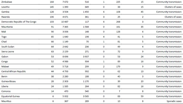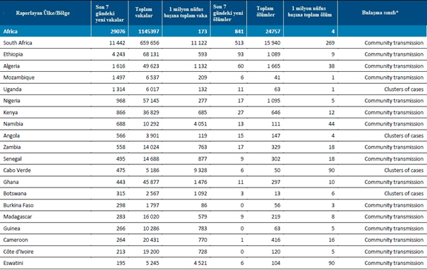 Son altı hafta boyunca, Afrika Bölgesi hem COVID-19 vakalarında hem de ölümlerde düşüş bildirmeye devam etmiştir. Geçen hafta, etkilenen 49 ülkeden 33'ü ya ölümlerde azalma olduğunu ya da hiç ölüm olmadığını bildirmiştir. Bölge bugüne kadar yaklaşık 25.000 kümülatif ölüm bildirmiştir ve bunun 15.900'ünü (%64) Güney Afrika oluşturmaktadır. Güney Afrika, en fazla sayıda yeni vaka ve yeni ölüm bildirmeye devam ederken, onu Etiyopya, Cezayir ve Mozambik izlemektedir. Özellikle Bölgedeki 49 etkilenen ülke/bölgeden 35'i genel bulaşmanın sürdüğünü bildirmeye devam etmektedir.
