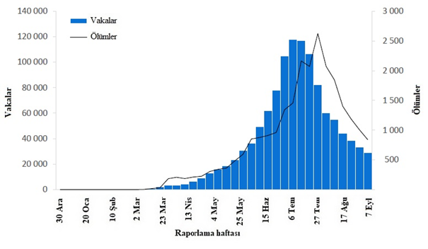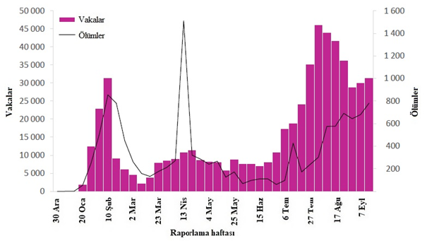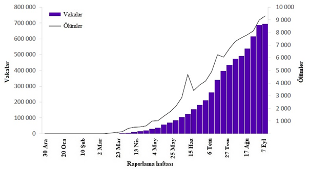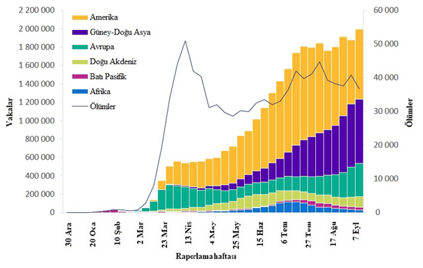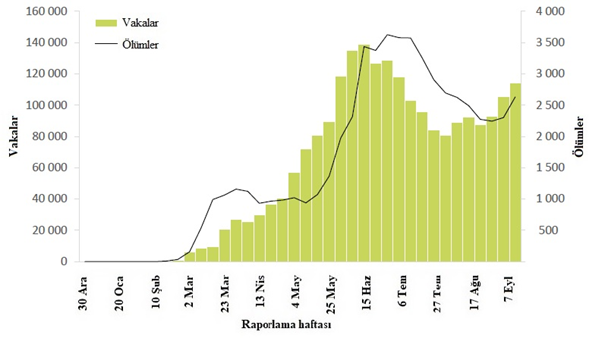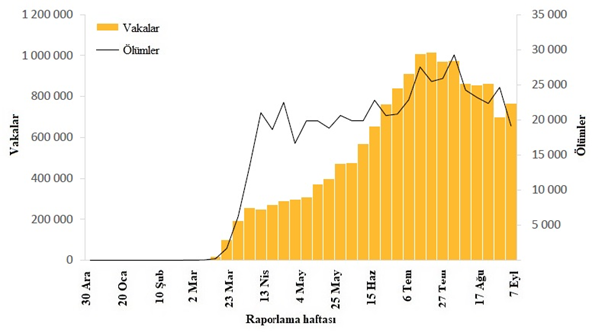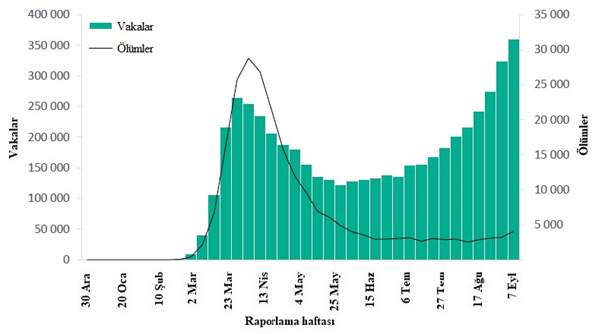 Bugüne kadar DSÖ'ye, 30,6 milyondan fazla COVID-19 vakası ve 950.000 ölüm bildirilmiştir. 14-20 Eylül arasındaki haftada, bir önceki haftaya göre %6'lık bir artışı temsil eden yaklaşık 2 milyon yeni COVID-19 vakası ve salgının başlangıcından bu yana tek bir haftada bildirilen en yüksek sayıdaki vaka bulunmaktadır. Aynı dönemde, ölümlerin sayısında %10'luk bir azalma olmuştur ve son yedi günde 37.700 ölüm bildirilmiştir (Şekil 1).