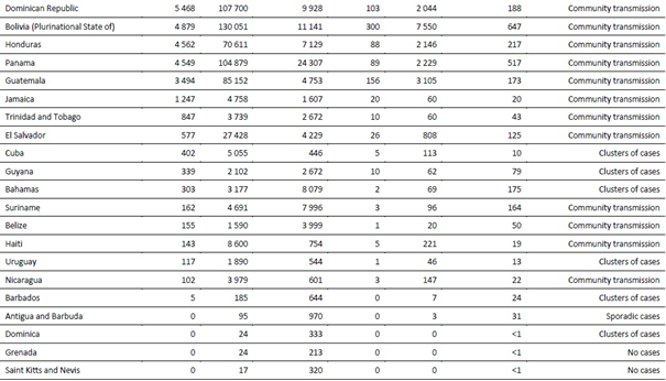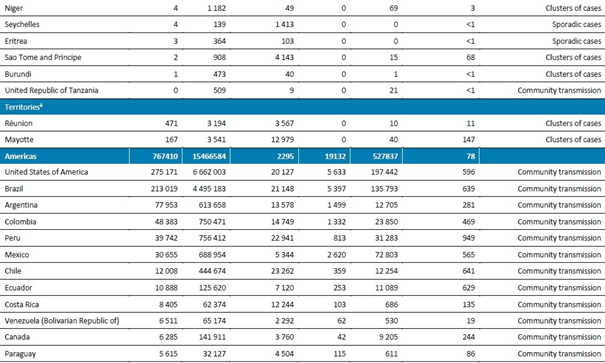 Amerika Bölgesi, rapor edilen tüm vakaların %50'sini ve ölümlerin %55'ini oluşturarak en çok etkilenen DSÖ Bölgesi olmaya devam etmektedir. Bölge geçtiğimiz hafta yeni vaka sayısında %10 artış bildirmiş olsa da, aynı zamanda önceki yedi güne göre ölümlerdeki en büyük düşüşü de yine bu bölge oluşturmaktadır (-%22)(Şekil 4). Bölgedeki 48 etkilenen ülke ve bölgeden 32 tanesi genel bulaşma rapor ederken, yalnızca 8'i sporadik bulaşma rapor etmektedir.