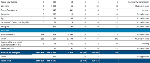 Genel olarak Batı Pasifik Bölgesi, küresel vakaların %2'sinden azını ve tüm ölümlerin %1.5'inden azını oluşturan en düşük kümülatif vakaları göstermeye devam etmektedir. Filipinler ve Japonya, bölgedeki en fazla yeni vaka ve yeni ölüm sayısına sahiptir. Malezya, Yeni Zelanda ve Papua Yeni Gine'de ölüm sayısında göreceli artışlar rapor edilmiştir.