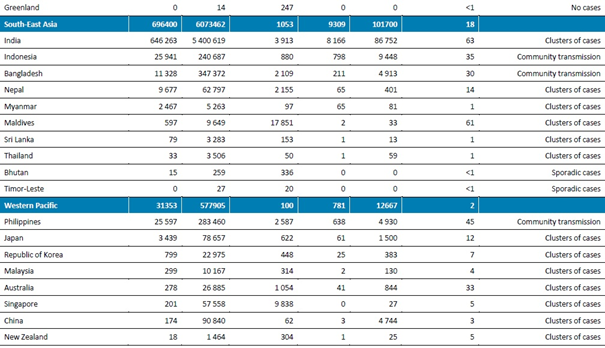 Güneydoğu Asya Bölgesi en çok etkilenen ikinci bölgedir ve son yedi gün içinde küresel olarak yeni rapor edilen vaka ve ölümlerin sırasıyla %35 ve %25'ini oluşturmaktadır. Vaka ve ölüm sayılarının Mart ayından bu yana istikrarlı bir şekilde artmasına rağmen, geçen hafta yeni vaka ve ölümlerde sırasıyla sadece %1 ve %4 artışla artış hızı yavaşlamıştır. En fazla yeni vaka bildiren ülkeler Hindistan, Endonezya ve Bangladeş olmaya devam ederken, Myanmar ve Nepal son yedi gün içinde yeni vakalardaki en yüksek artışı göstermiştir.