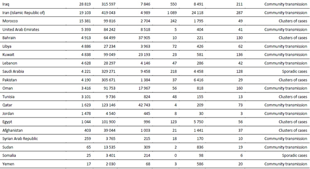 Doğu Akdeniz Bölgesinde bildirilen vaka ve ölüm sayısı son üç haftada tutarlı bir şekilde (Şekil 5), son yedi günde ise sırasıyla %8 ve %14 artmıştır. En yüksek sayıda yeni vaka Irak, İran ve Fas tarafından bildirilmiştir. Bir önceki haftaya göre vakalarda en büyük göreli artışı Ürdün, Umman ve Tunus bildirmiştir. İran en yüksek yeni ölüm sayısını bildirirken, bir önceki haftaya göre ölümlerde en büyük artışı Tunus ve Afganistan bildirmiştir.