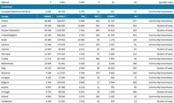 DÜNYA SAĞLIK ÖRGÜTÜ’NÜN 20.09.2020 TARİHLİ YENİ KORONAVİRÜS (COVID-19) HAFTALIK DURUM RAPORU