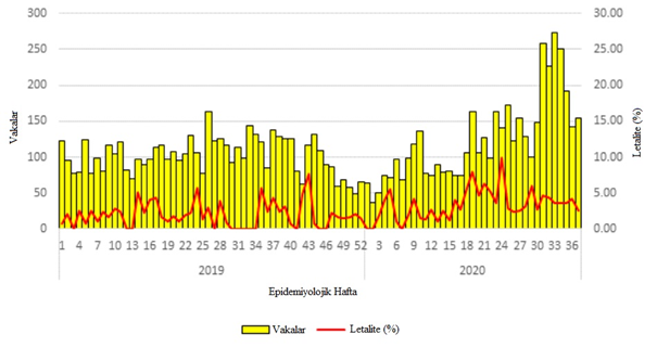 Şekil 1: 1 Ocak 2019'dan 13 Eylül 2020'ye kadar, şüpheli maymun çiçeği vakalarının ve vaka ölüm oranının epi haftasına göre dağılımı