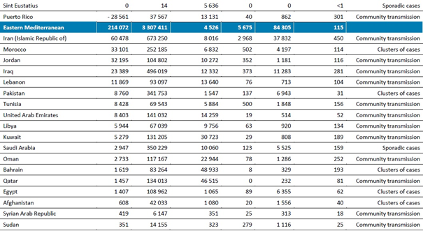 Doğu Akdeniz Bölgesi'nde haftalık yeni vaka sayısı bir önceki haftaya göre %18 artarak kümülatif vaka sayısını 3,3 milyonun üzerine çıkarmıştır. Geçtiğimiz hafta, bölgedeki yeni ölümlerin sayısı %23 artarak kümülatif ölüm sayısını 84.000'in üzerine çıkarmıştır. İran İslam Cumhuriyeti, Fas, Ürdün, Irak ve Lübnan son yedi gün içinde en fazla yeni vaka sayısını bildirmiştir.