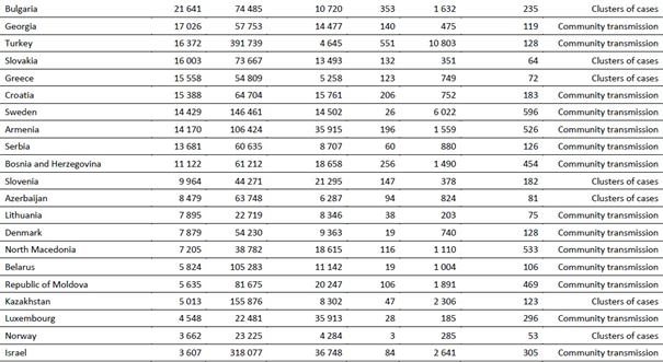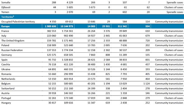 Bu hafta bölge, tüm yeni vakaların %54'ünü ve tüm yeni ölümlerin %47'sini kaydetmiştir ve bu oranlar, bölgedeki kümülatif sayıları 13 milyondan fazla vakaya ve 311.000 ölüme çıkarmıştır. Çekya, Belçika ve Slovenya kişi başına en yüksek ölüm oranlarını bildirirken, Fransa, İspanya ve İtalya'da son 7 günde ölümler önemli ölçüde artmıştır ve bu ülkeler en yüksek yeni ölüm sayısını bildirmiştir. Avrupa Bölgesi'ndeki Üye Devletlerin çoğu, mevcut bulaşma yollarını ya genel bulaşma (%55, n=34) ya da vaka kümeleri (%32, n=20) olarak tanımlamaktadır.